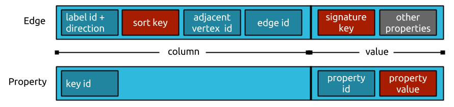 Each edge and property is stored as one cell in the rows of its adjacent vertices. They are serialized such that the byte order of the column respects the sort key of the edge label. Variable id encoding schemes and compressed object serialization are used to keep the storage footprint of each edge/cell as small as possible.
