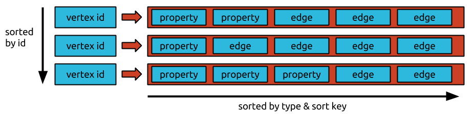 JanusGraph stores graphs in adjacency list format which means that a graph is stored as a collection of vertices with their adjacency list. The adjacency list of a vertex contains all of the vertex’s incident edges (and properties).